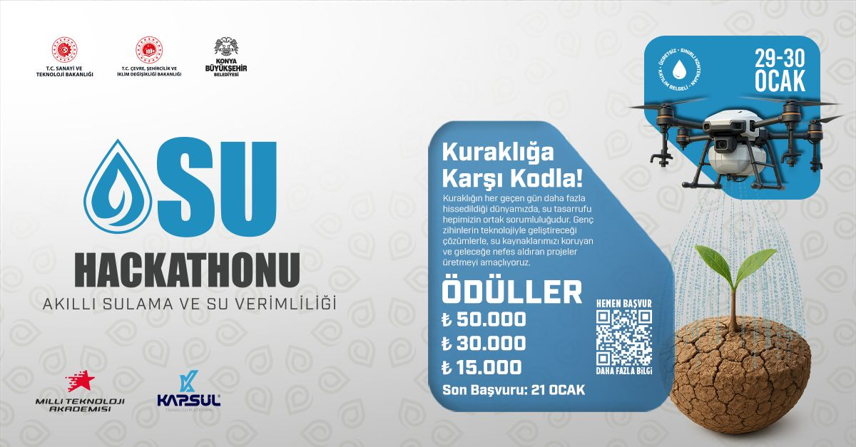 Sürdürülebilir su yönetimi, akıllı sulama sistemleri ve tarımsal verimlilik konularında teknolojik çözümler üretecek ekipler, 29-30 Ocak 2026 tarihlerinde Konya'da bir araya geliyor.